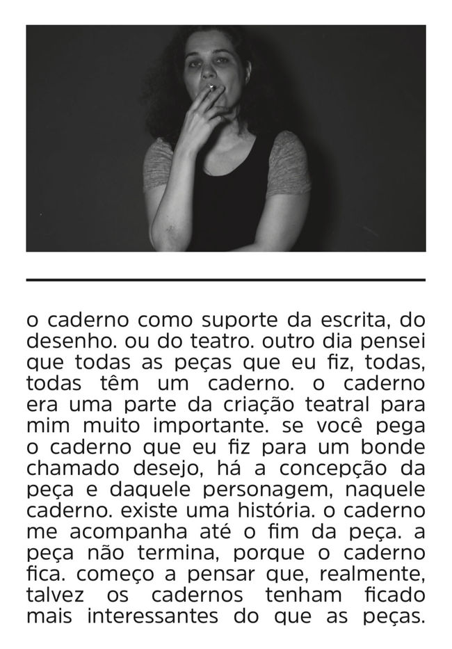 uma investigação sobre o tema do desaparecimento, iniciada a partir de 3 entrevistas com uma amiga sobre suas incursões à reclusão. observando pistas deixadas nessas conversas, o trabalho tem módulos que são chamados cadernos, pois uma destas pistas é a sugestão de que toda a existência se organize ao redor deste formato: uma publicação em formato de xerox chamada manual para enfrentar o desaparecimento; uma instalação com um globo de espelhos suspenso no ar; e uma publicação em formato de livro de postais. ao se folhear o livro, as páginas vão se destacando da lombada. assim, enquanto mantiver suas páginas intactas, o trabalho é estéril. apenas quando o livro deixa de existir na sua forma original, a ideia do objeto se realiza.